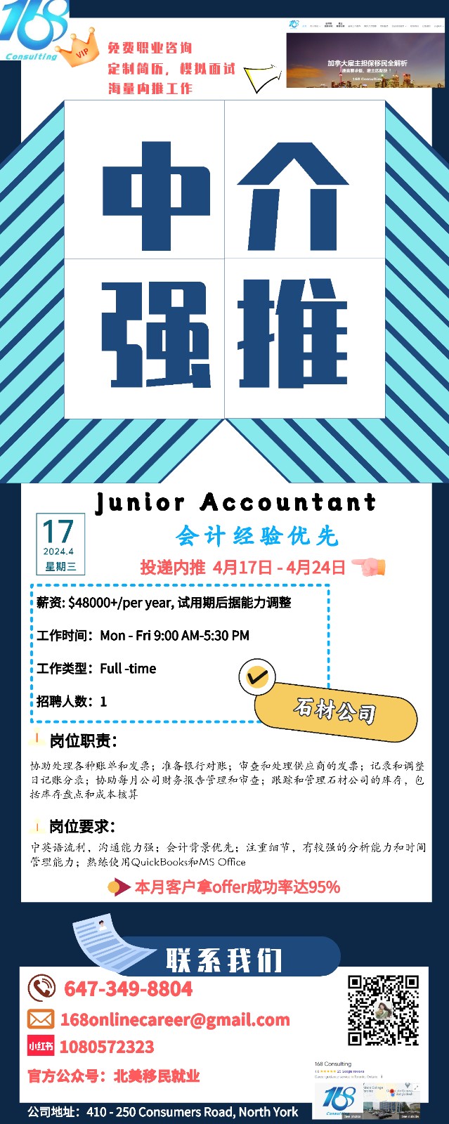 【168新岗】士嘉堡石材公司招聘Junior Accountant 1名