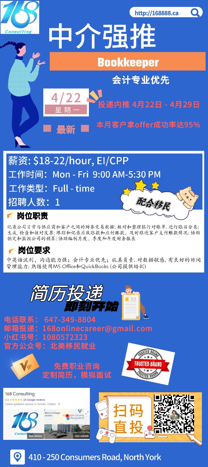 【168新岗】密西建材公司招聘Bookkeeper 1名(可移民)