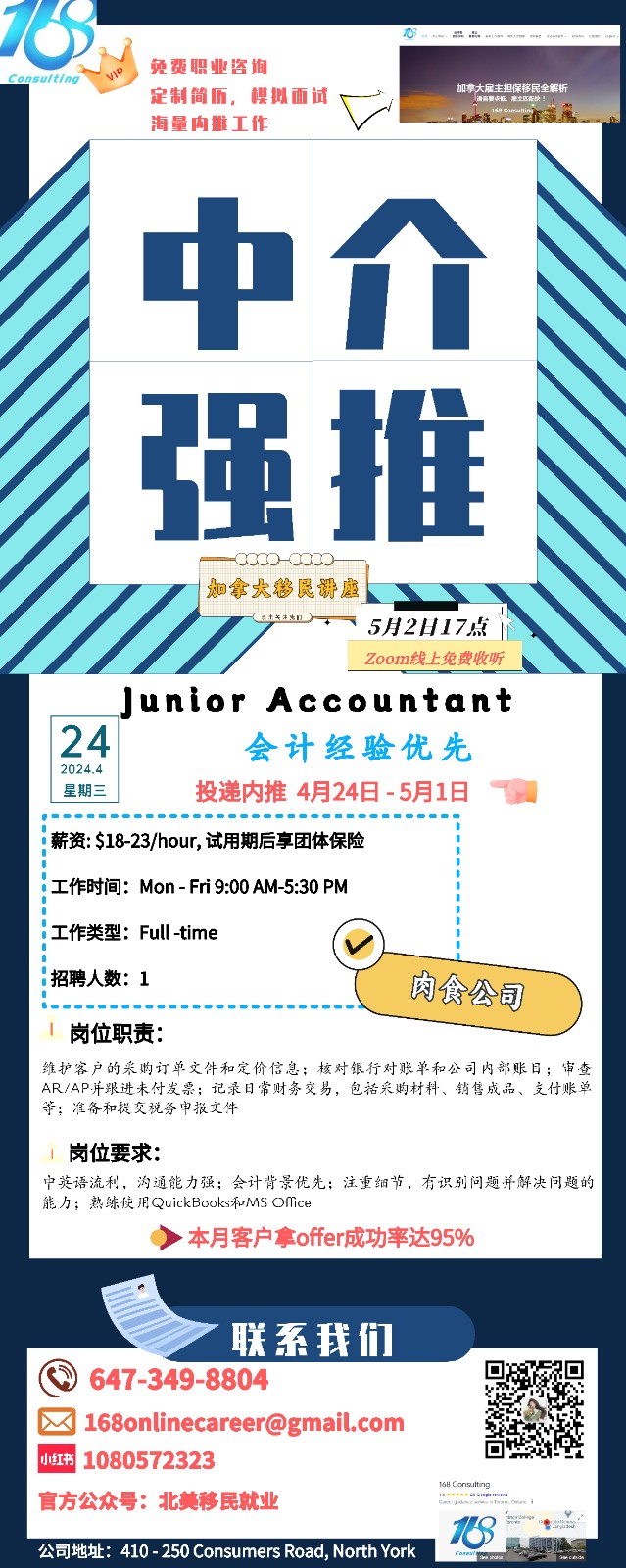 【168新岗】北约克肉食公司招聘Junior Accountant 1名