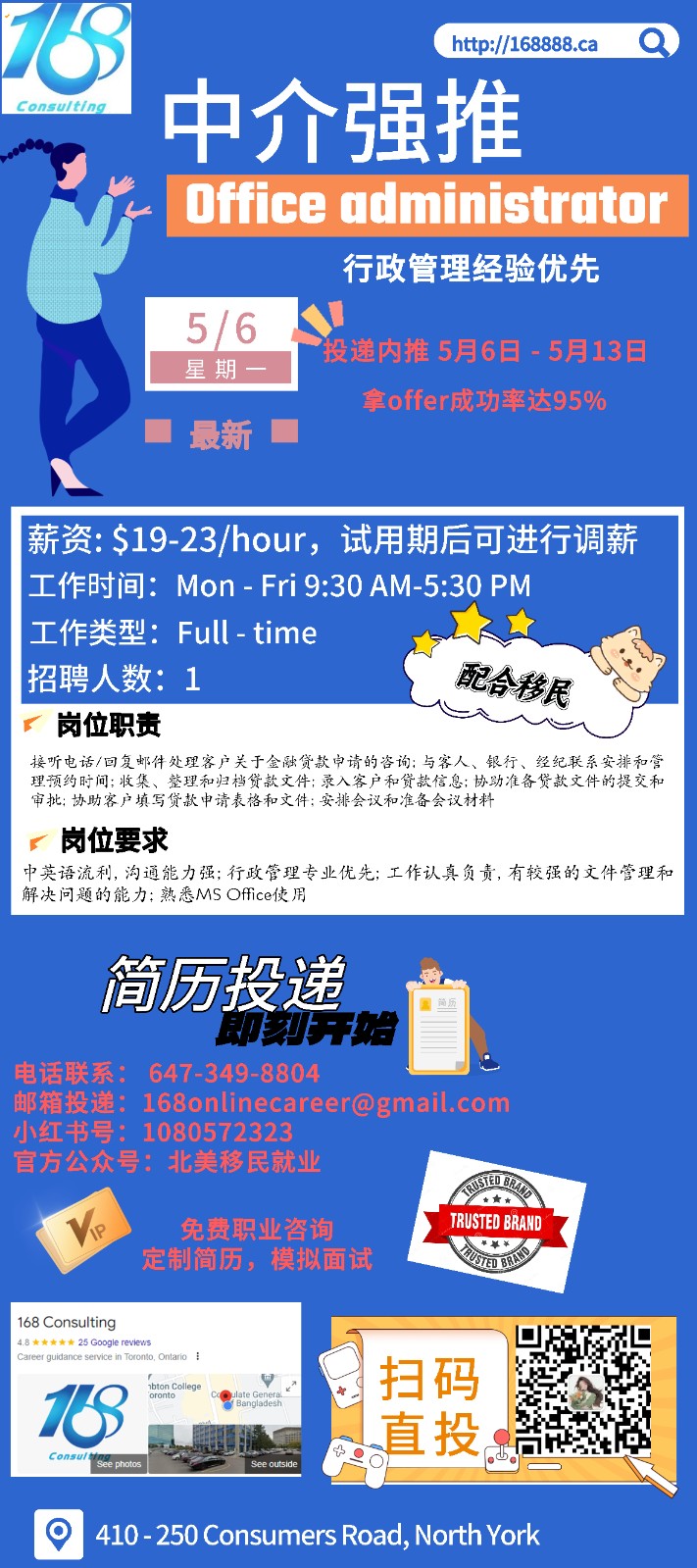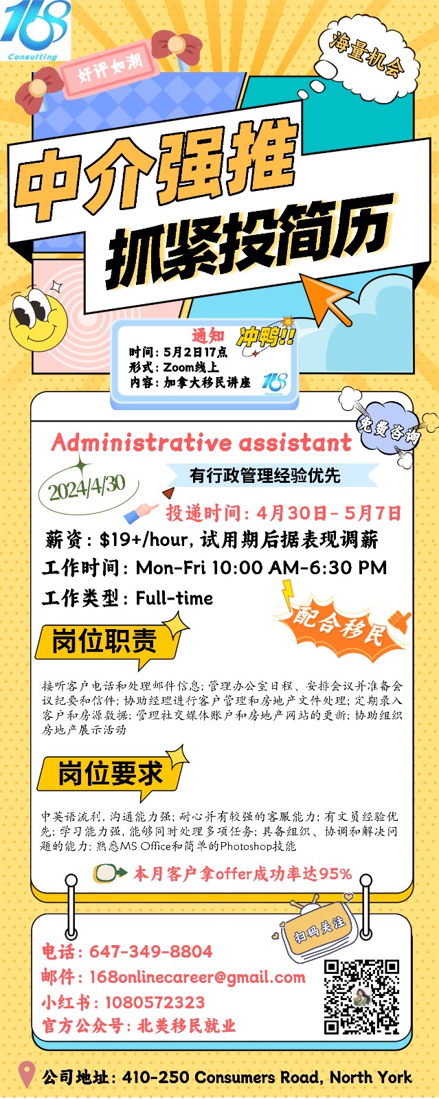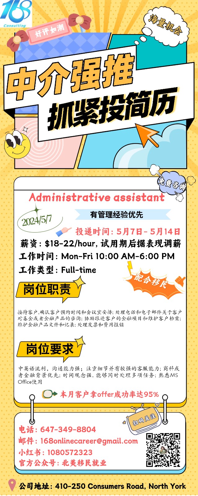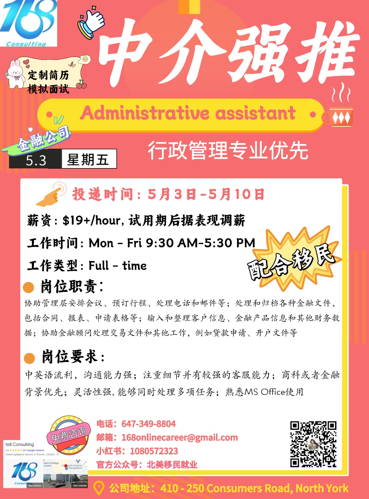 【168新岗】万锦金融公司招聘Administrative assistant 1名 (可移民)