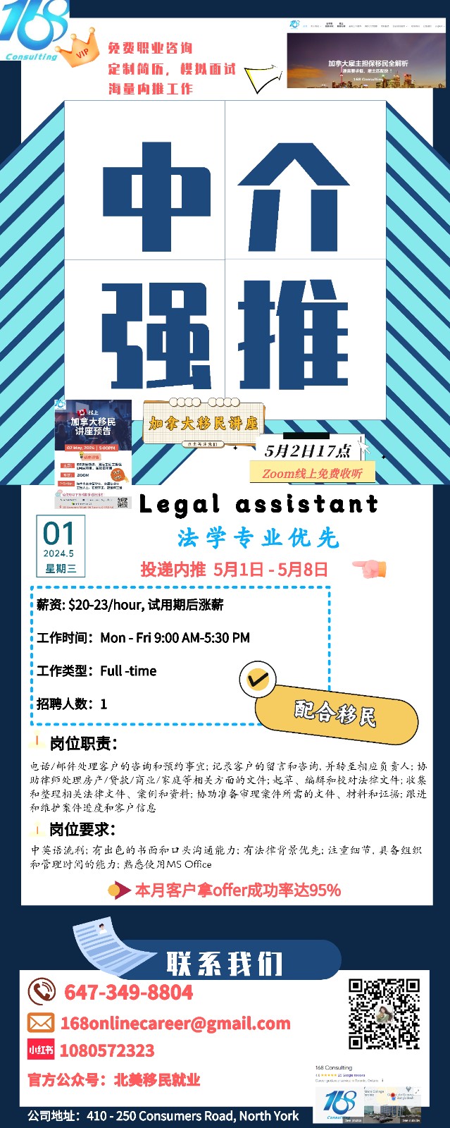 【168新岗】北约克律师事务所招聘Legal assistant(可移民)