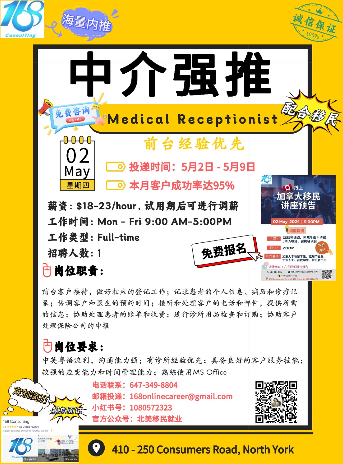 【168新岗】密西中医诊所招聘Medical Receptionist 1名