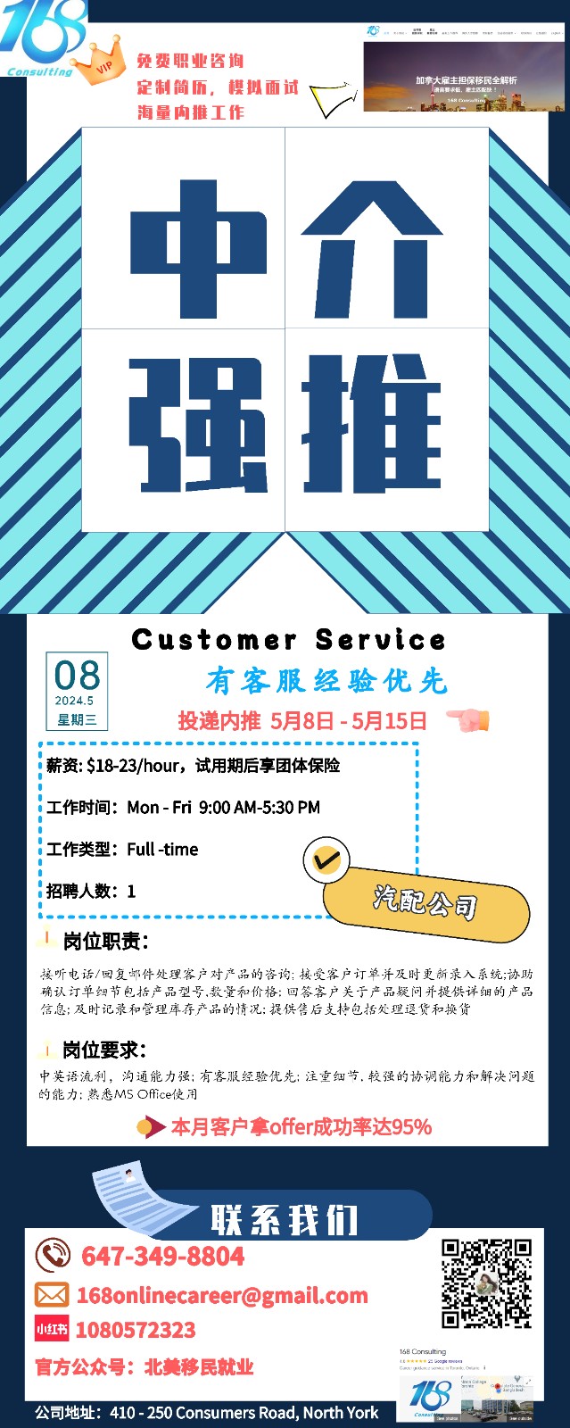 【168新岗】密西汽配公司招聘Customer Service 1名